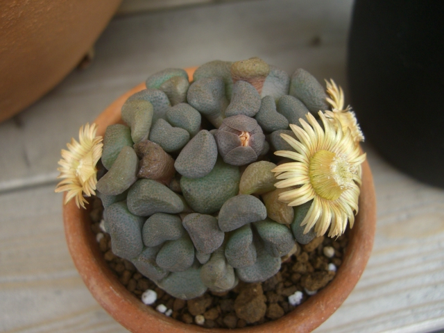 メセンの塊根性です。まだ、株が小さいので塊根も小さいですが、花は立派です。