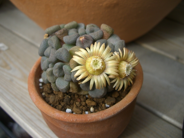 メセンの塊根性です。まだ、株が小さいので塊根も小さいですが、花は立派です。