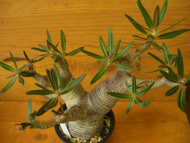 <特徴> 肌は赤褐色。葉はグラキリスのような細長い。花は大きな黄花。