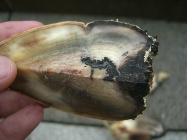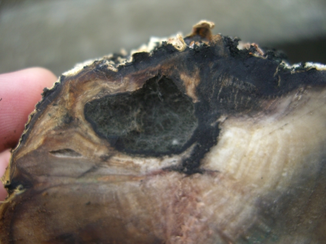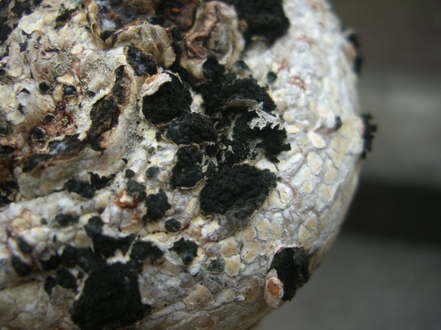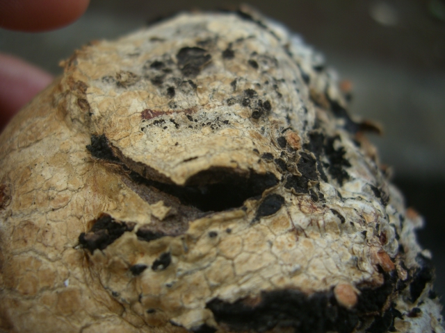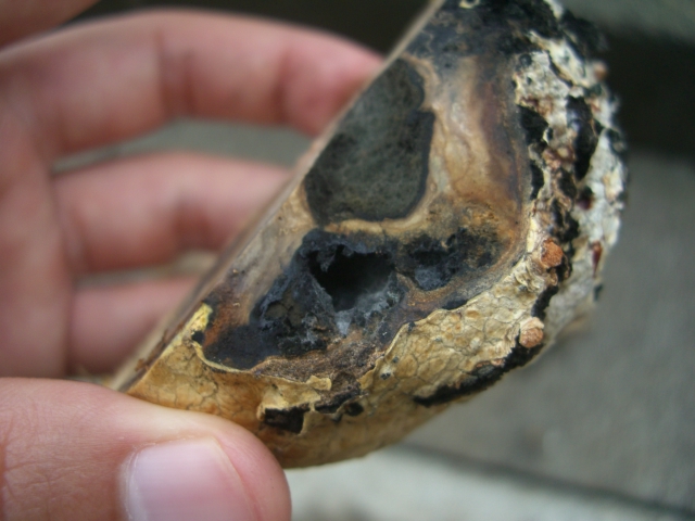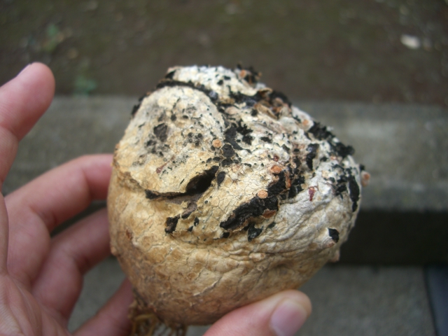 急に葉が萎れはじめ、イモに黒っぽいススのようなものが目に付くようになりました。